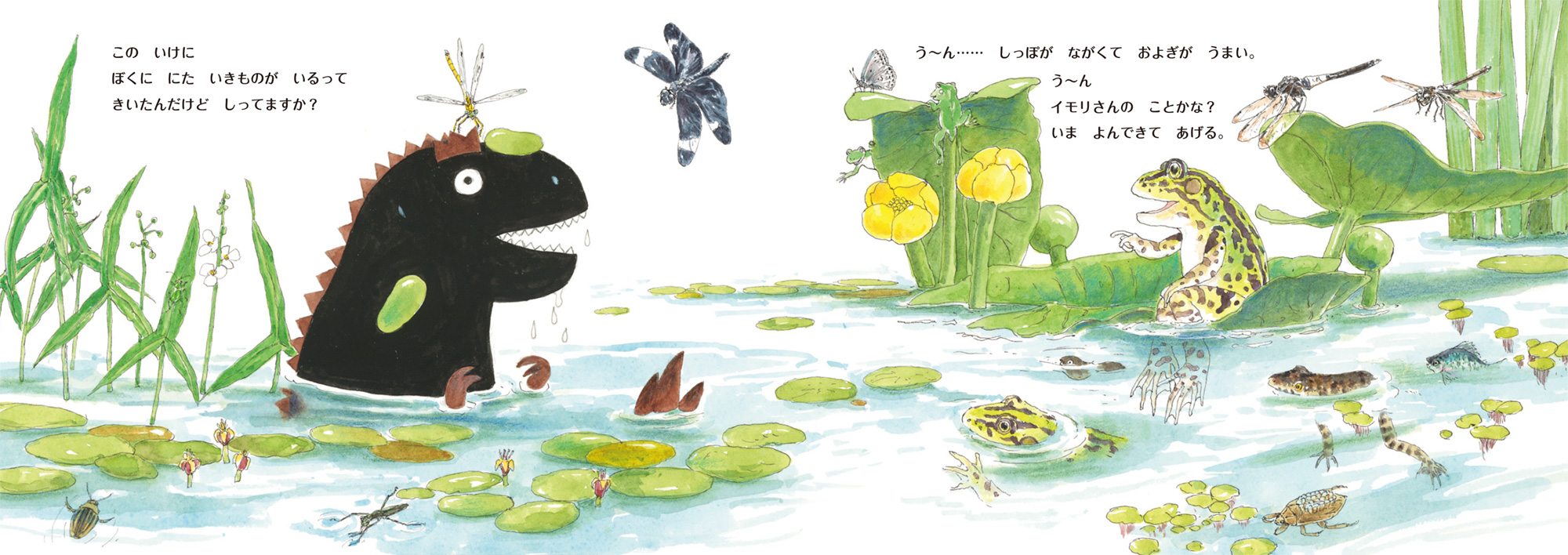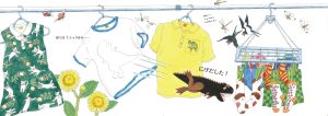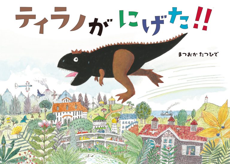 Tシャツの中でひとりさびしいティラノサウルス。仲間を探しに外へ飛び出し、自然の中で、さまざまな生きものと出会います。